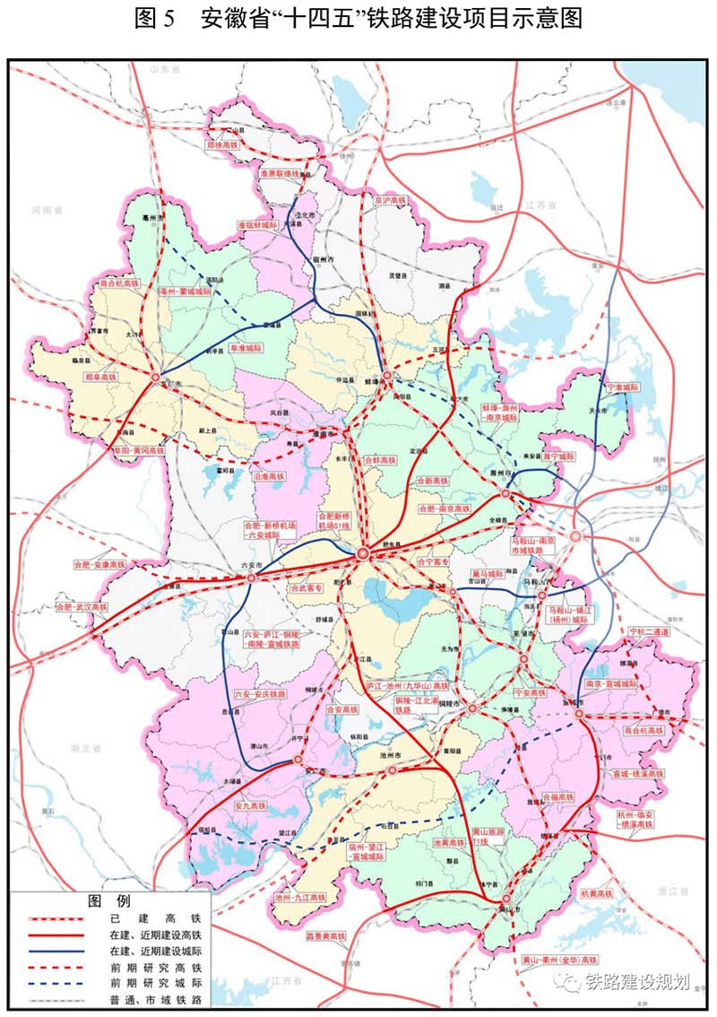 深化前期(或研究)工作的有:沿淮鐵路、黃山—衢州(金華)鐵路、武漢—馬鞍山北鐵路、宿松—望江—宣城城際、合蕪宣城際鐵路,南京至含山市域(郊)鐵路、蚌埠市城市軌道工程、馬鞍山市域鐵路線工程、宣城市域鐵路線工程。