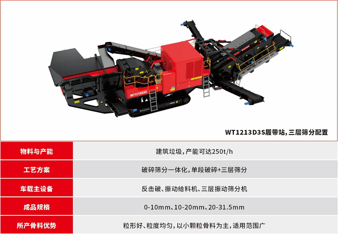 如西安客戶選用的為兩層篩的履帶站(WT1213DS,篩分規格:0-10mm、10-50mm),相應篩分出0-10mm、10-50mm兩種規格的骨料,還有三層篩的履帶站(WT1213D3S,篩分規格:0-10mm、10-20mm、20-31.5mm)可供客戶選擇。