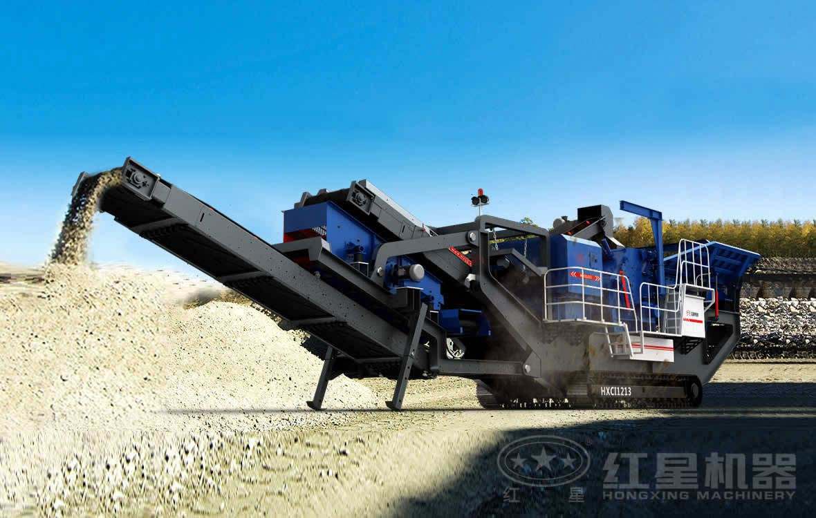 該生產線設備主要用來破碎大理石、鐵礦石,服務于該國家公路網建設。這已經是紅星與該公司第三次合作,客戶訂購的第四條砂石骨料生產線即將安裝調試。物料先送入顎破移動破碎站進行粗破,破碎后的物料經振動篩篩分進入反擊破移動破碎站進行細碎,破碎后的成品由輸送帶輸出。