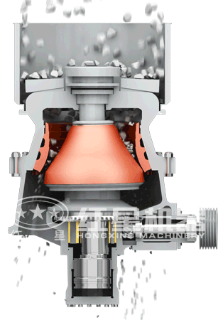 單缸圓錐破碎機工作時:電機帶動破碎機的小齒輪,小齒輪帶動大齒輪,大齒輪組件(大齒輪、大齒輪架、偏心鋼套)帶動偏心套組件(偏心缸套、偏心銅套)和主軸組件(主軸、內錐、內錐襯板)以理論垂直線為中心,在銅襯套內公轉,主軸組件在偏心銅套內以主軸的中心線可以實現自轉。空機運行的時候,偏心套組件“抱著”主軸組件和隨大齒輪一同公轉,當物料加入到破碎腔后,主軸總成(主軸、內錐)在物料的阻力下在偏心銅套內緩慢的自轉。內錐的運行軌跡看起來是在破碎腔內來回擺動,同時緩慢的旋轉。物料被擺動的內錐擠壓破碎。支撐套與架體連接處靠液壓缸壓緊,當破碎機內落入金屬塊等不可破碎物體時,單缸的動錐由底部液壓活塞托起,起到排放口調整和過鐵保護、反復起落排除堵礦的作用。